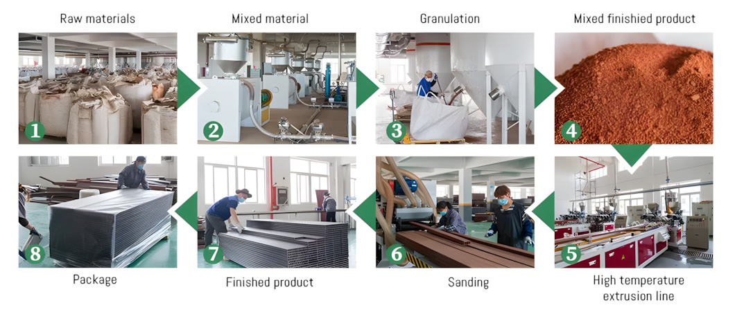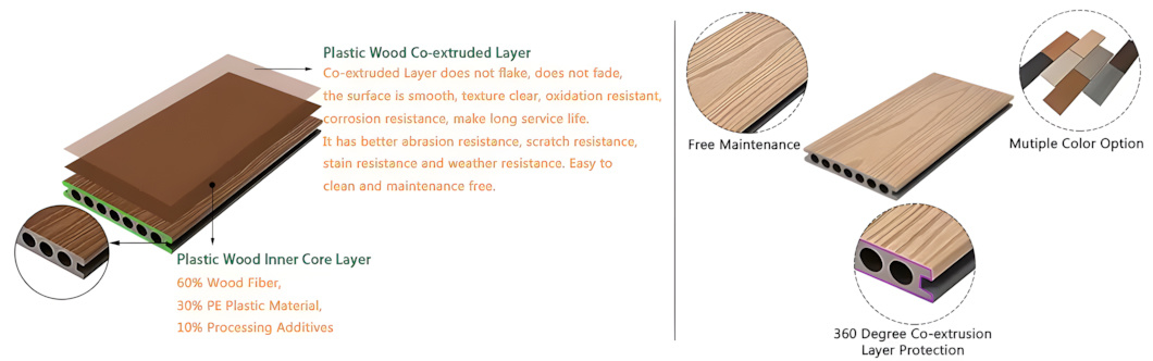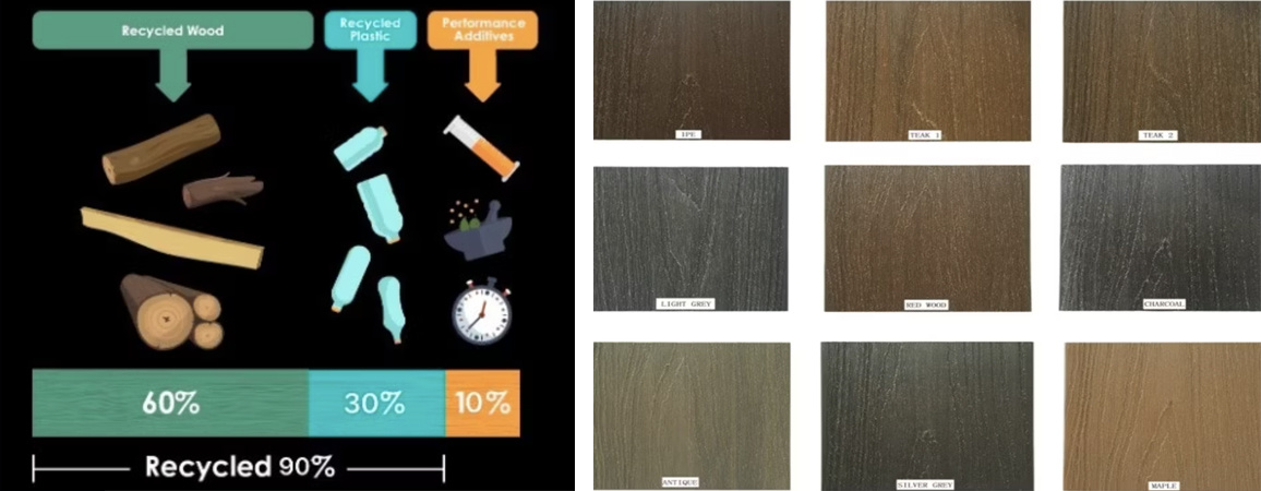 Surface Treatment | Grinding, Embossing, Brushing, Smoothing | WPC Components | 30% HDPE + 65% Wood Fiber + 5% Additives |